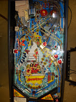 This machine is in good shape except for a lot of dirt at the playfield, worn out rubbers and some missing parts. There are also quite a lot of lights and switches that does not work at the playfield and the shark fin flipper is dead. I think I found the reason for most of these problems when looking under the playfield, quite a lot of the cables in the wire loom to the top has been chewed off by rats. They have left their business cards at the bottom of the cabinet, a lot of rat droppings. First thing to do is to get the playfield out of the cabinet to get the wire loom up on to the work bench to find and repair all the damaged wires.